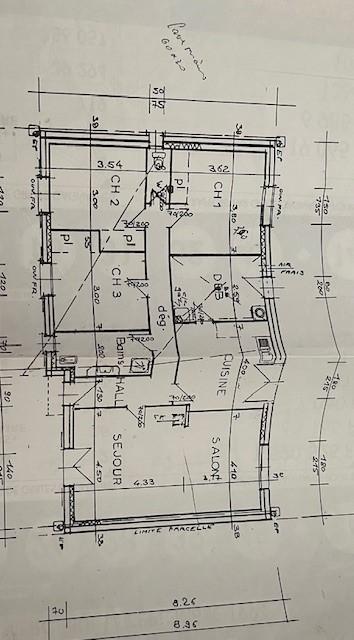 Entrée, séjour-salon avec cheminée insert donnant sur terrasse exposée SUD, cuisine a/e, lingerie, 3 chambres avec rangements, salle d'eau récente avec placard, wc avec lave-mains.