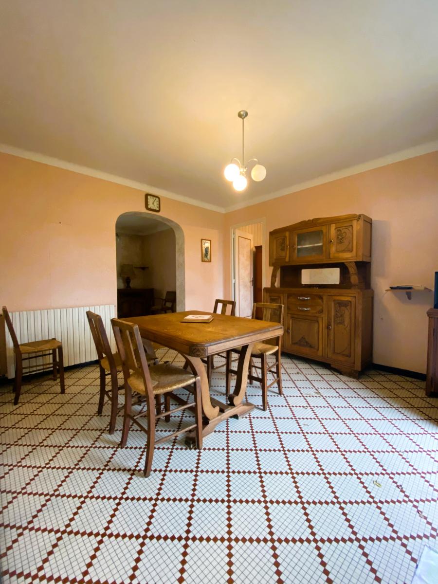 En village, sur 786m² de terrain clos, maison de plain-pied de 1971 de 65m² (surface totale) composée comme suit : Salon-séjour, cuisine A/e, deux chambres, salle d'eau WC, dégagement